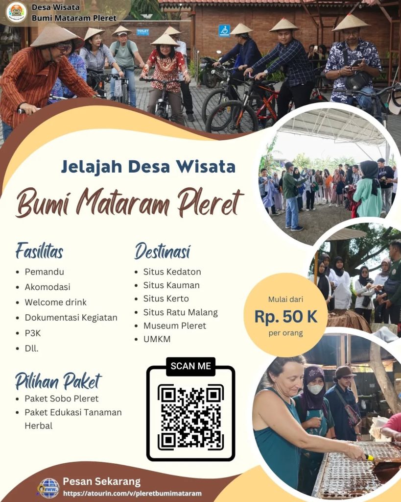 Desa Wisata Bumi Mataram Pleret menghadirkan pengalaman wisata edukatif dan rekreatif yang menggabungkan sejarah, budaya, seni, dan kehidupan masyarakat lokal. Setiap paket wisata dirancang dengan prinsip desa membangun, sehingga selain berwisata, Anda juga ikut berkontribusi dalam pemberdayaan ekonomi masyarakat.